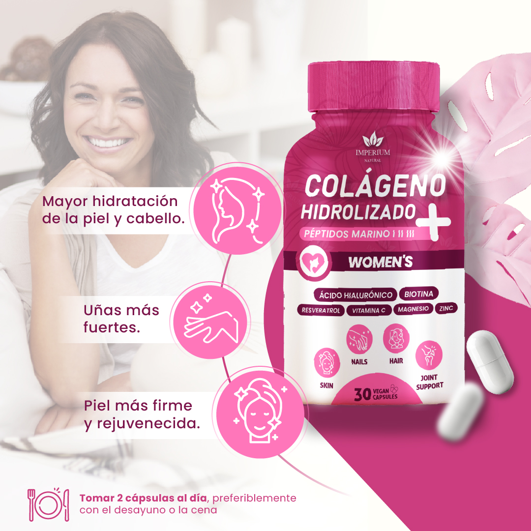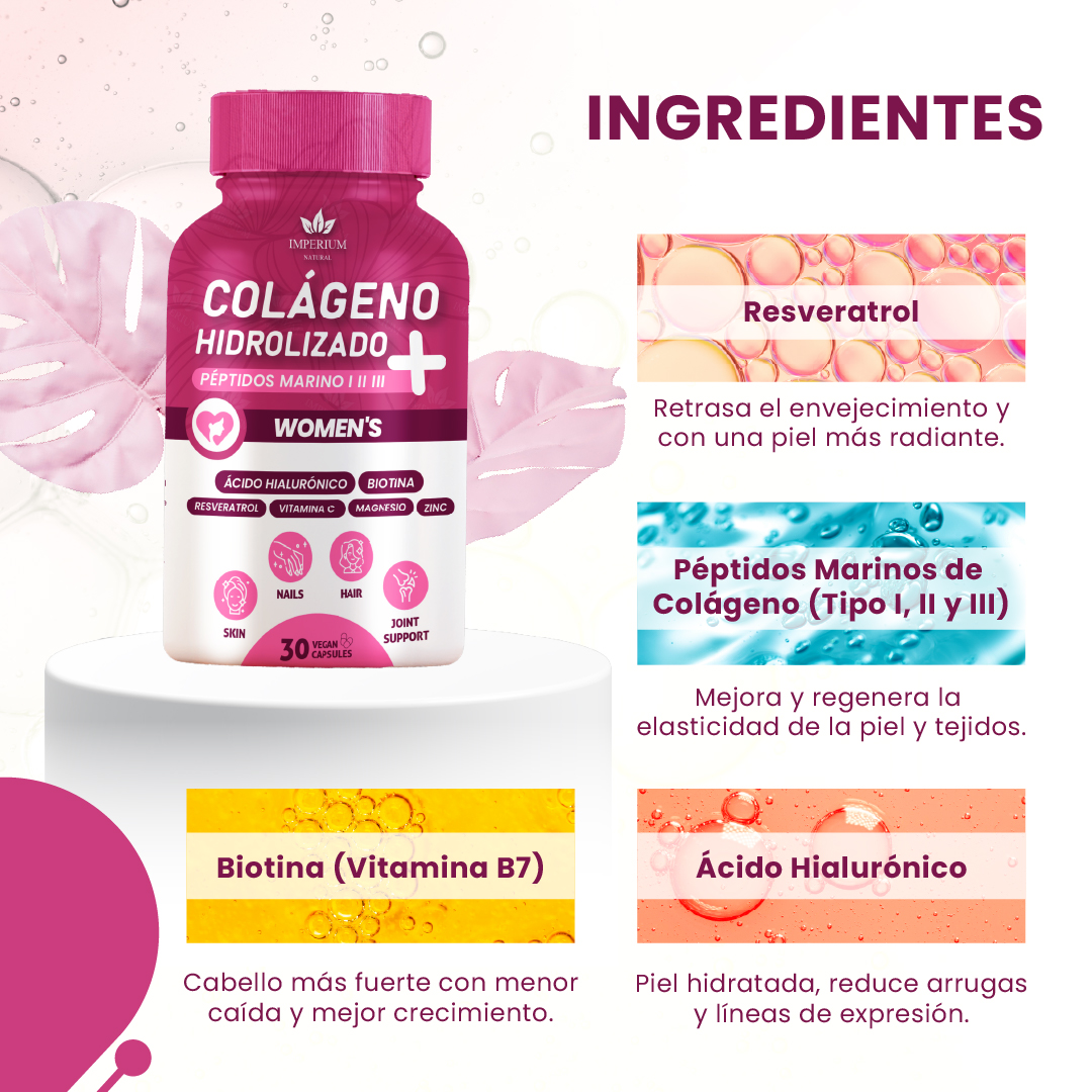 Su fórmula combina péptidos de colágeno marino tipo I, II y III, junto con ingredientes funcionales como biotina, ácido hialurónico, resveratrol, vitamina C, magnesio y zinc, que trabajan en conjunto para favorecer la regeneración de tejidos, mejorar la elasticidad de la piel y fortalecer estructuras como el cabello, las uñas y las articulaciones.